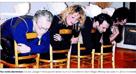 Neben Chandler spielte und las die vierköpfige Kölner Schauspielergruppe "GANGART" Szenen aus Werken wie Eugen Egners "Aus dem Tagebuch eines Trinkers", J.D. Salingers "Der Fänger im Roggen" oder Frank McCourts "Die Asche meiner Mutter". Natürlich fanden alle Protagonisten der unterhaltsamen und melancholischen Geschichten irgendwann immer die Zeit für ein Gläschen Whisky. Der wird zuweilen auch "Whiskey" buchstabiert, je nachdem, ob man ihn in Schottland, den USA, Kanada oder Irland genießt.
