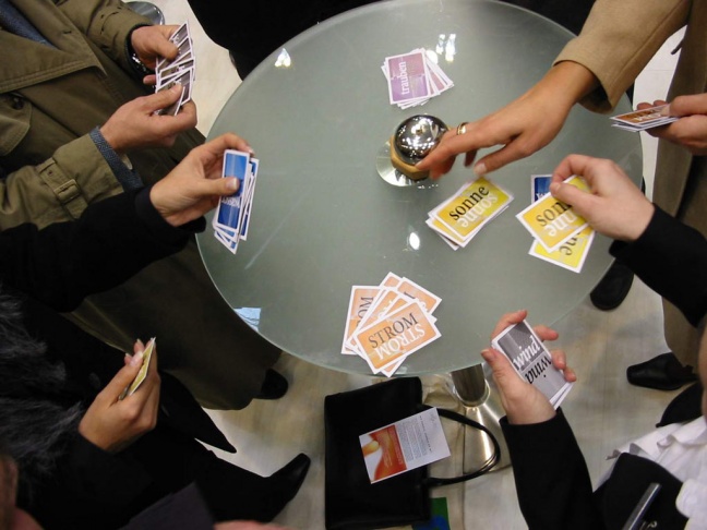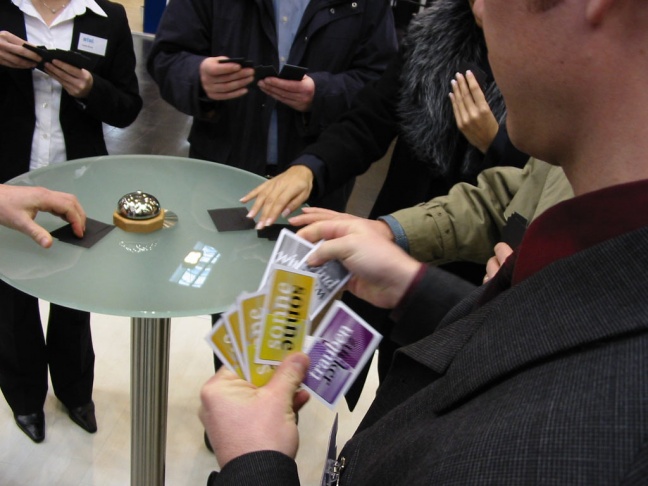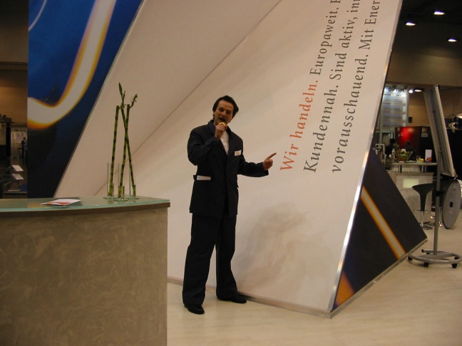 Unser MesseModerator und Animationskünstler tritt als ‚Händler’ (im in den Firmenfarben geschneiderten Anzug) auf und bindet mit einem speziell entwickelten Kartenspiel die Besucher an den Messe-Stand. Bis zu 10 Besucher schlüpfen in die Rolle eines Energiehändlers und versuchen durch geschicktes Tauschen der Spielkarten „Energie-Zertifikate“ zu erhandeln.